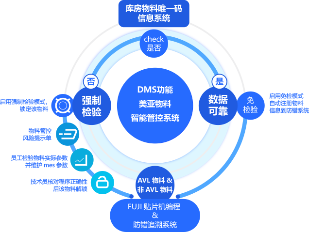 貼片機編程&物料掃描系統——基於(yú)MES的物料包裝信息自動創建物料貼片信息。對於(yú)未check的物料先暫時禁用,待現場確認核對其4個參數後,再依據MES維護後的物料信息自動創建物料貼片信息並(bìng)對該物料放行生産。